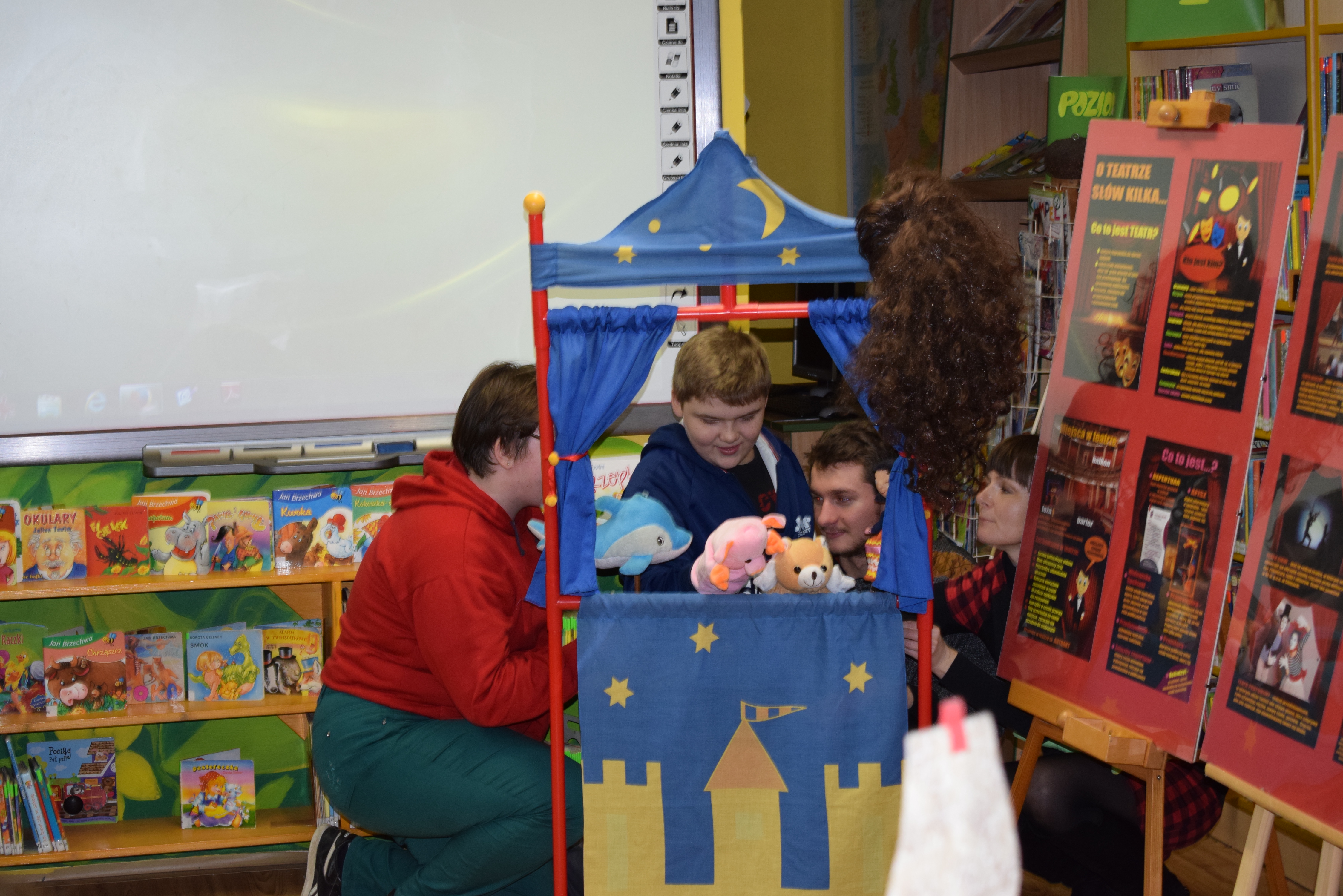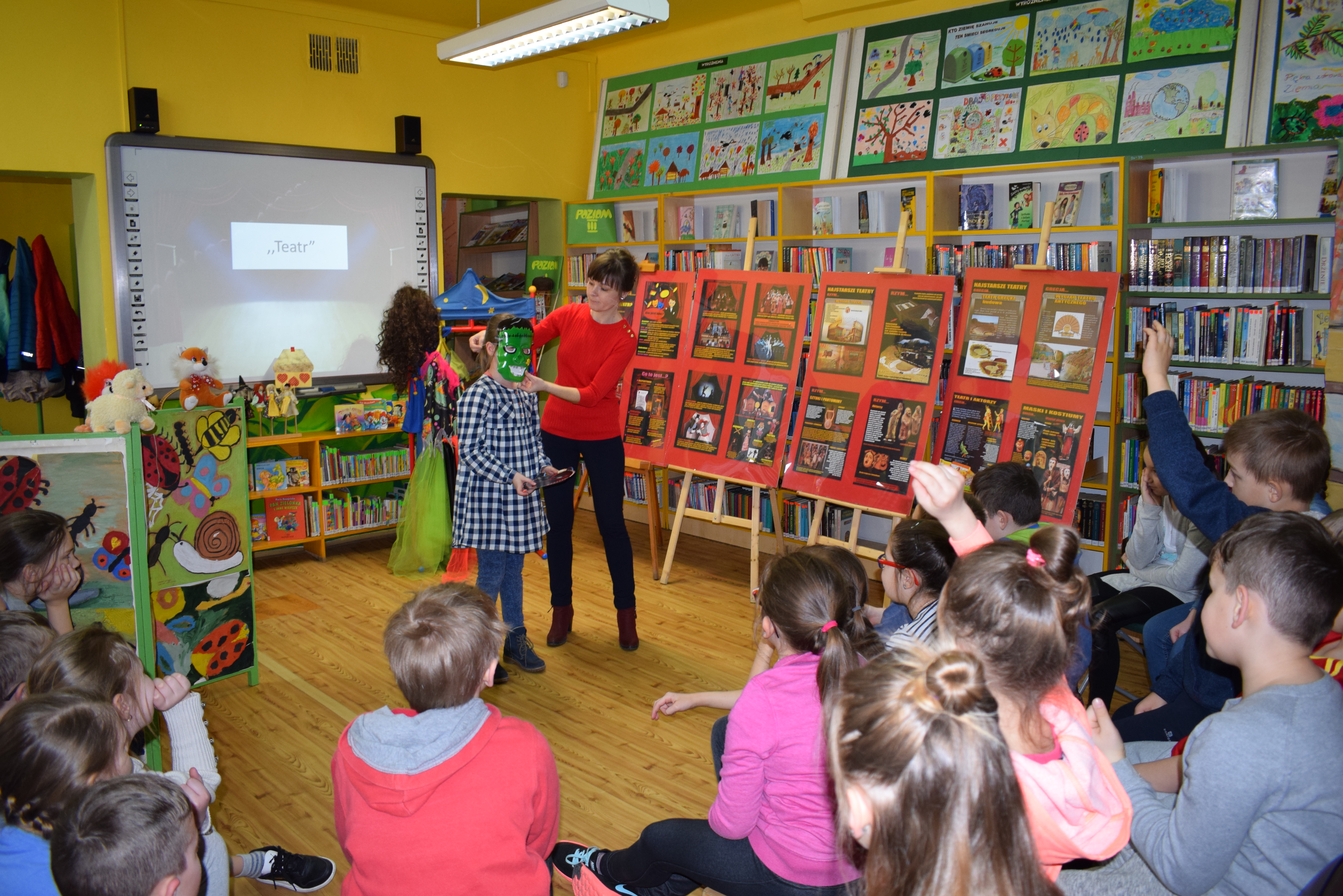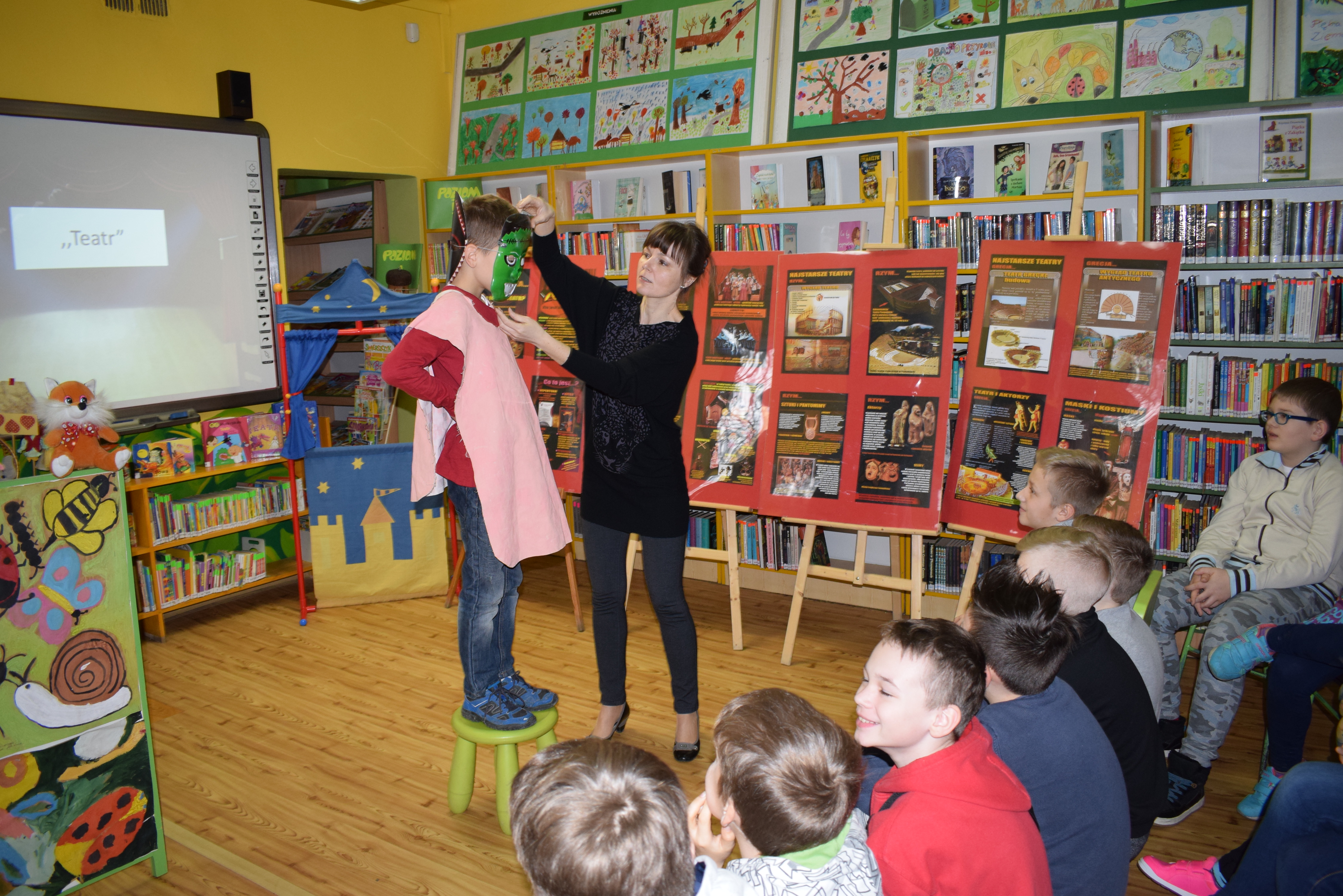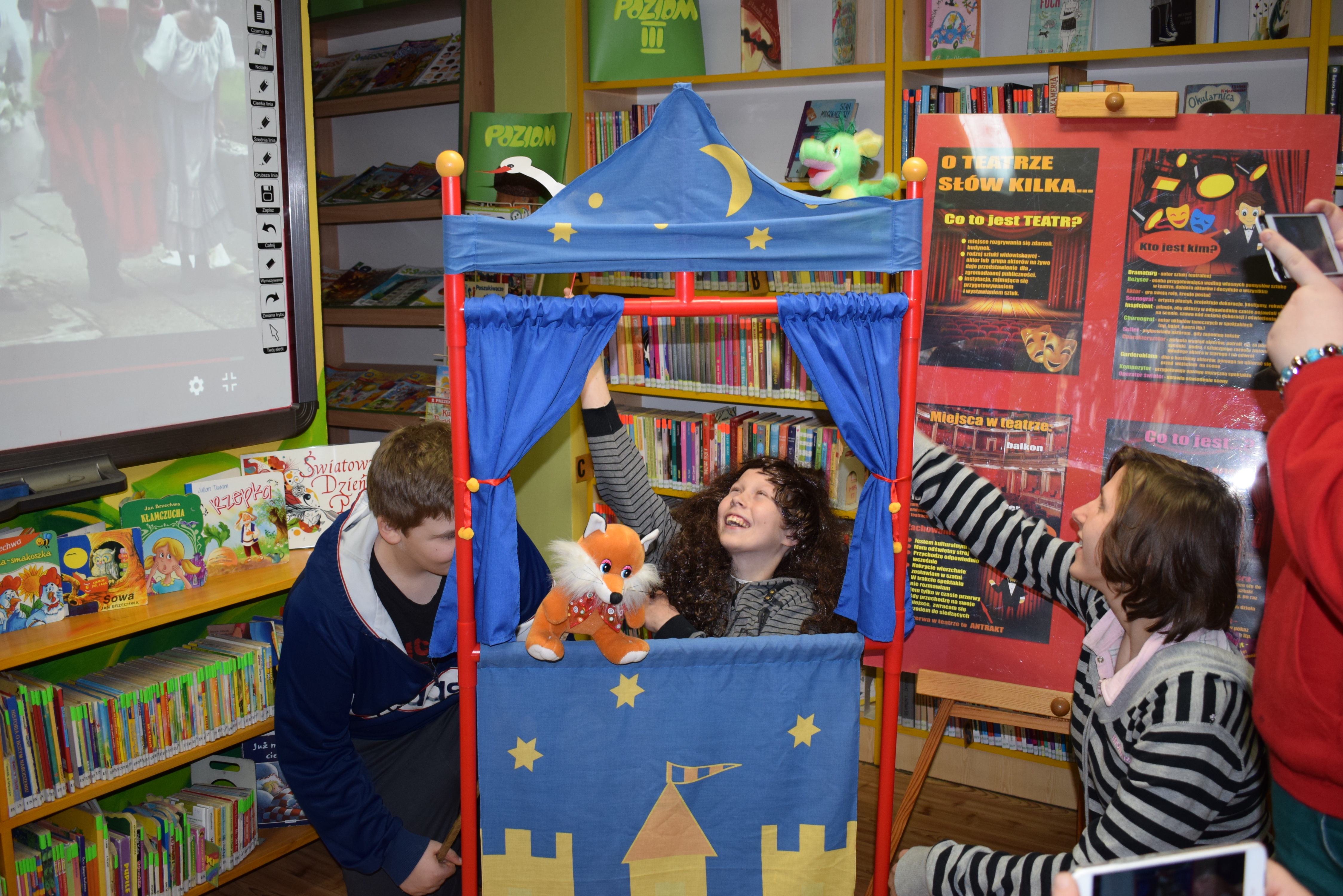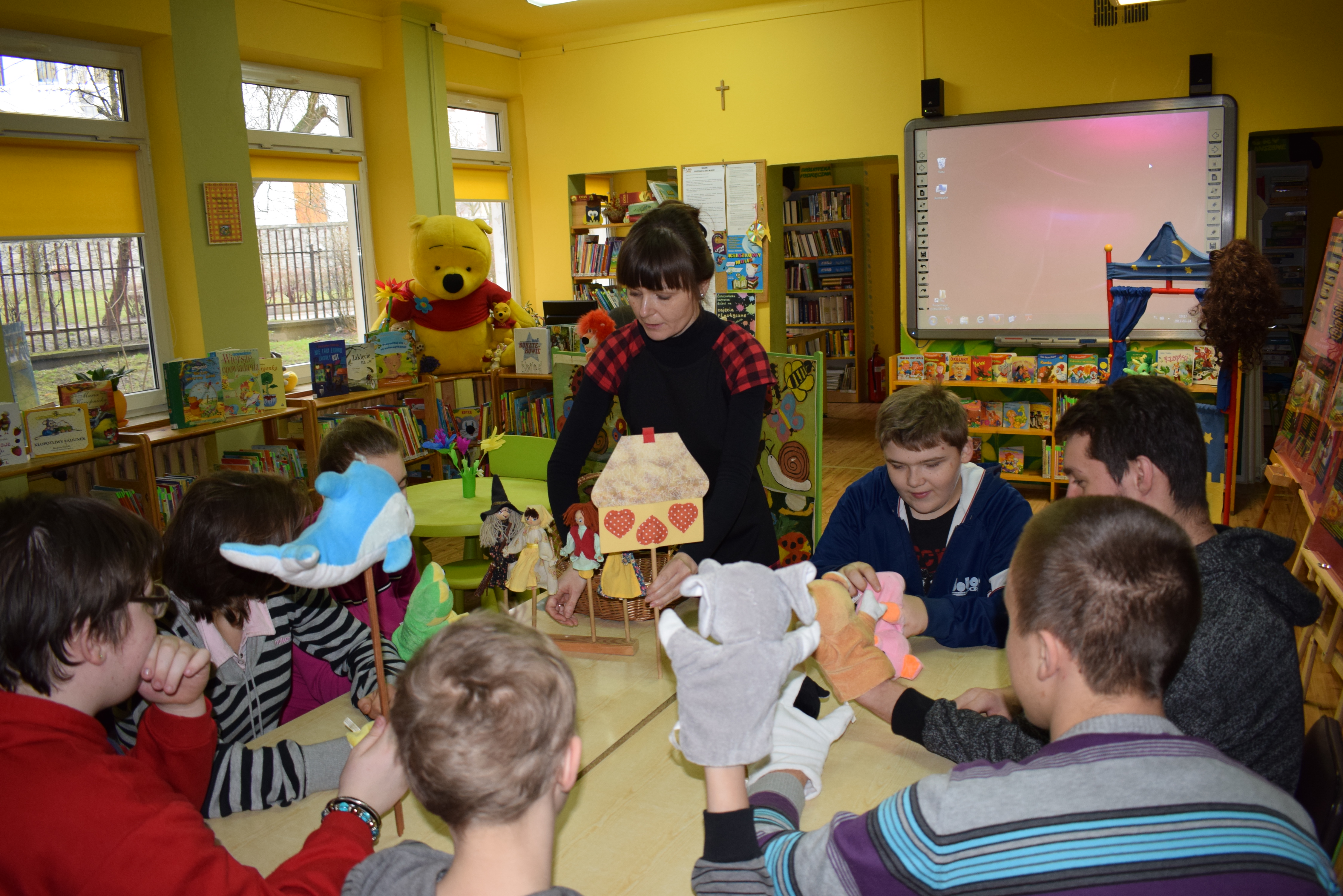 24 marca 2017 r. rozpoczęliśmy spotkanie o tematyce teatralnej. Zajęciom towarzyszy wystawa pt. "O teatrze słów kilka". jakie są teatry, jak wyglądały kiedyś, czy trudna jest praca na scenie, o tym wszystkim rozmawialiśmy z uczniami Gimnazjum z Zespołu Szkół Specjalnych w Kraśniku. Na zakończenie wspólnie odegraliśmy scenkę "Bocian i żaby", a na deser zostawiliśmy sobie oglądanie Teatru cieni.