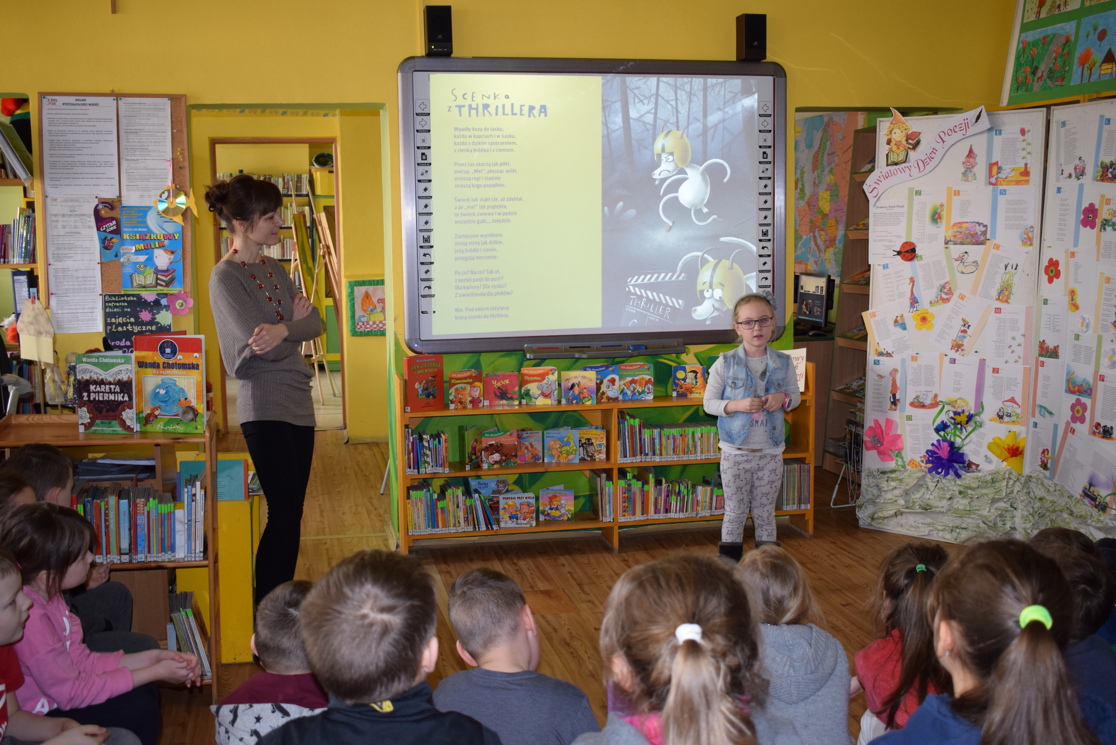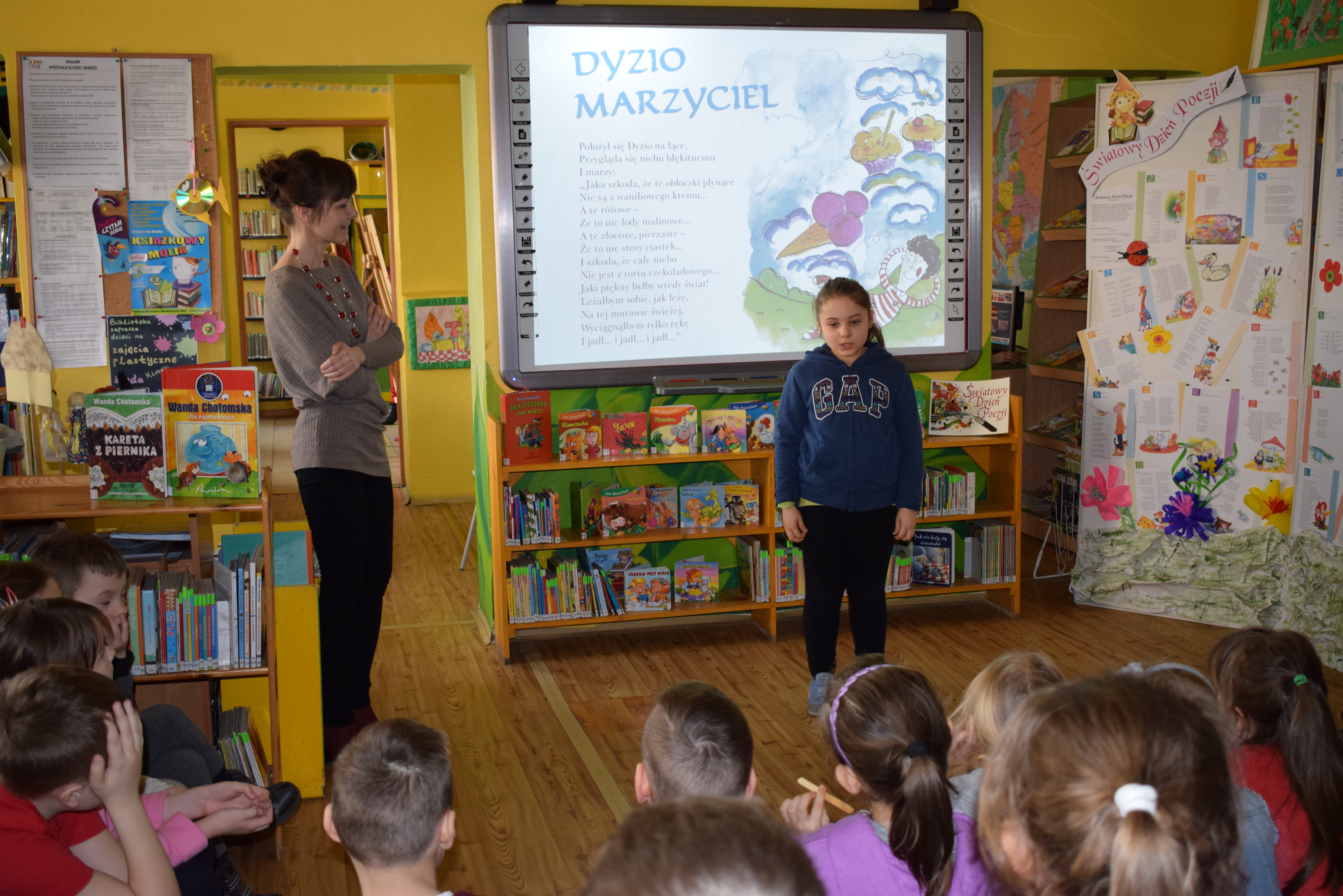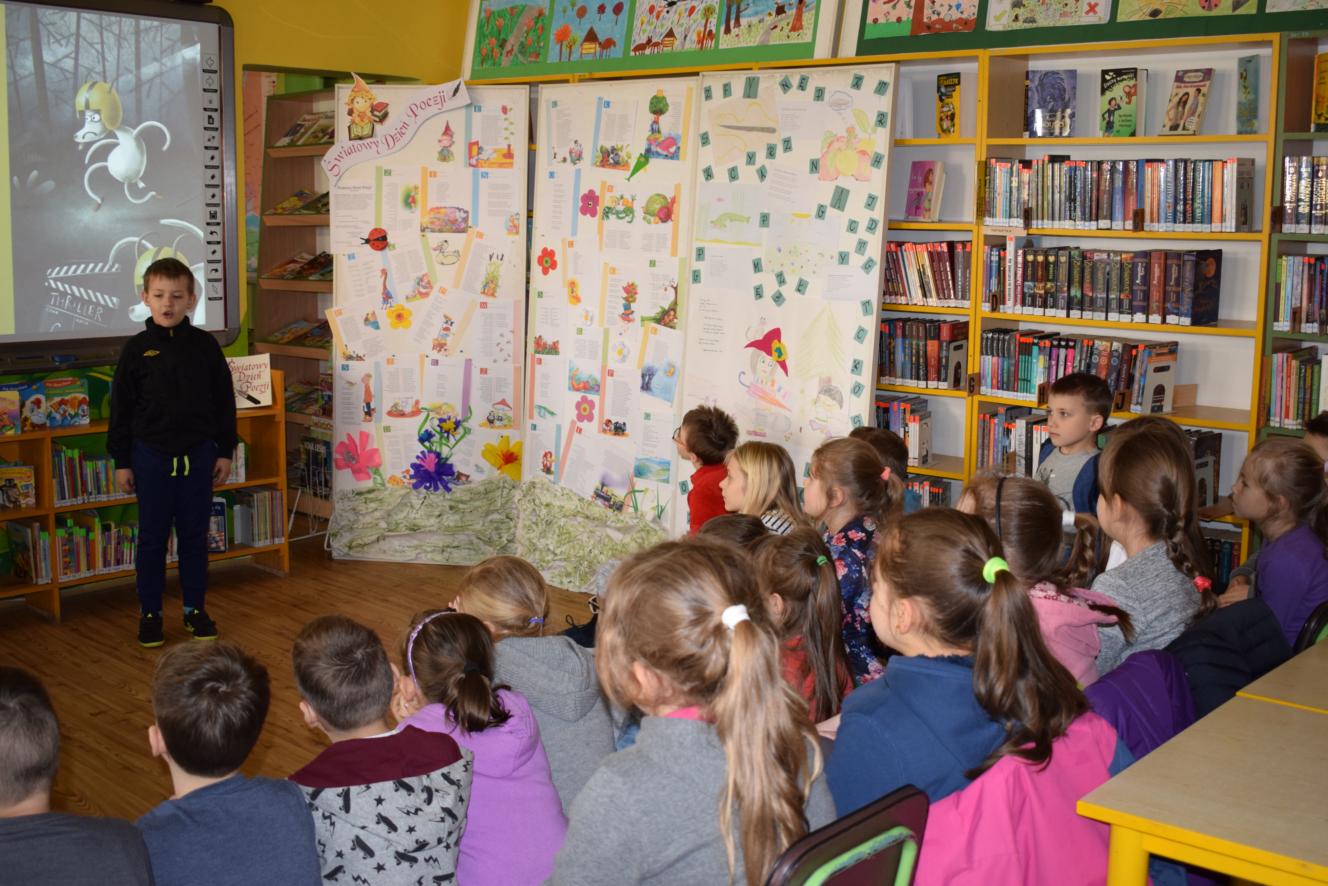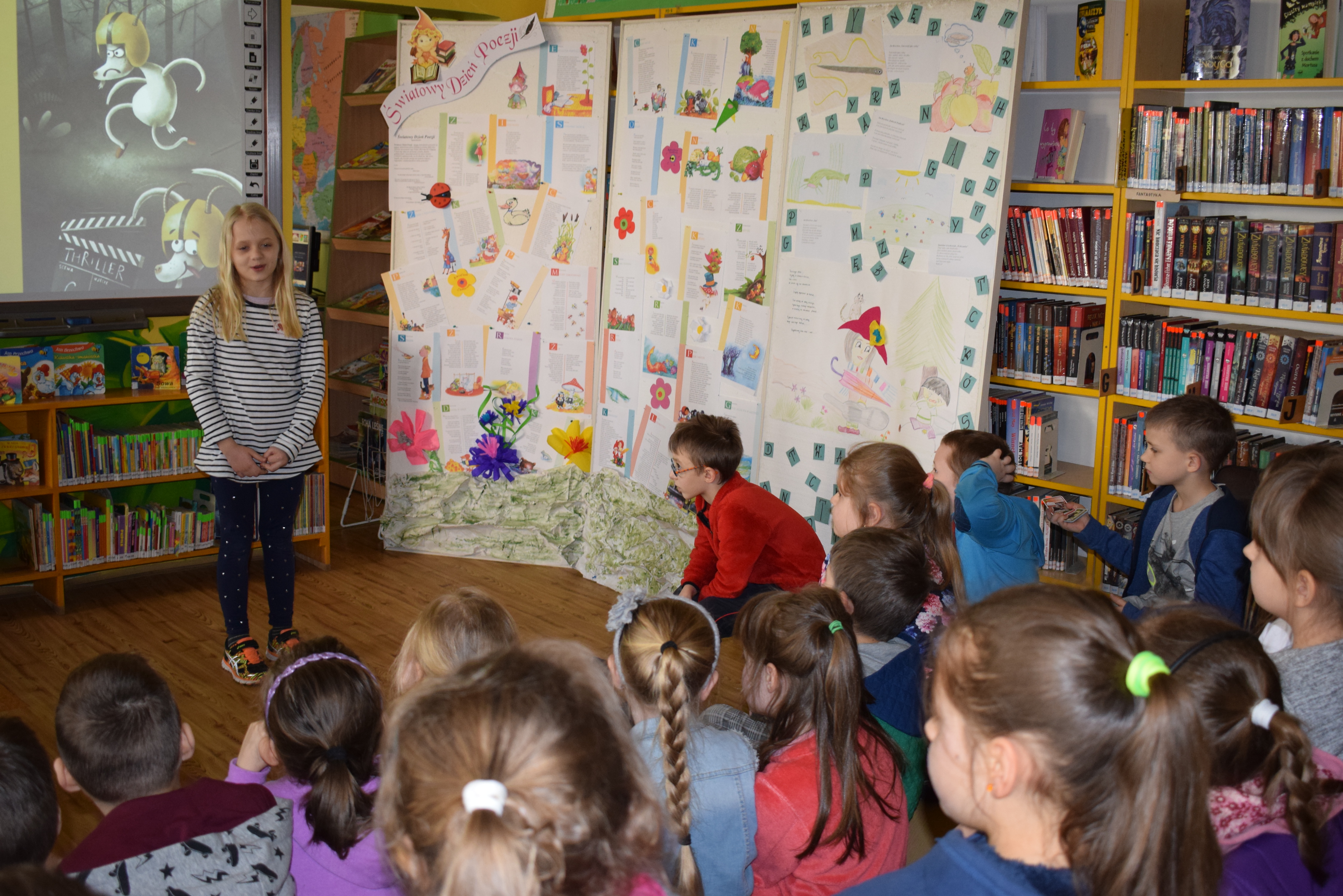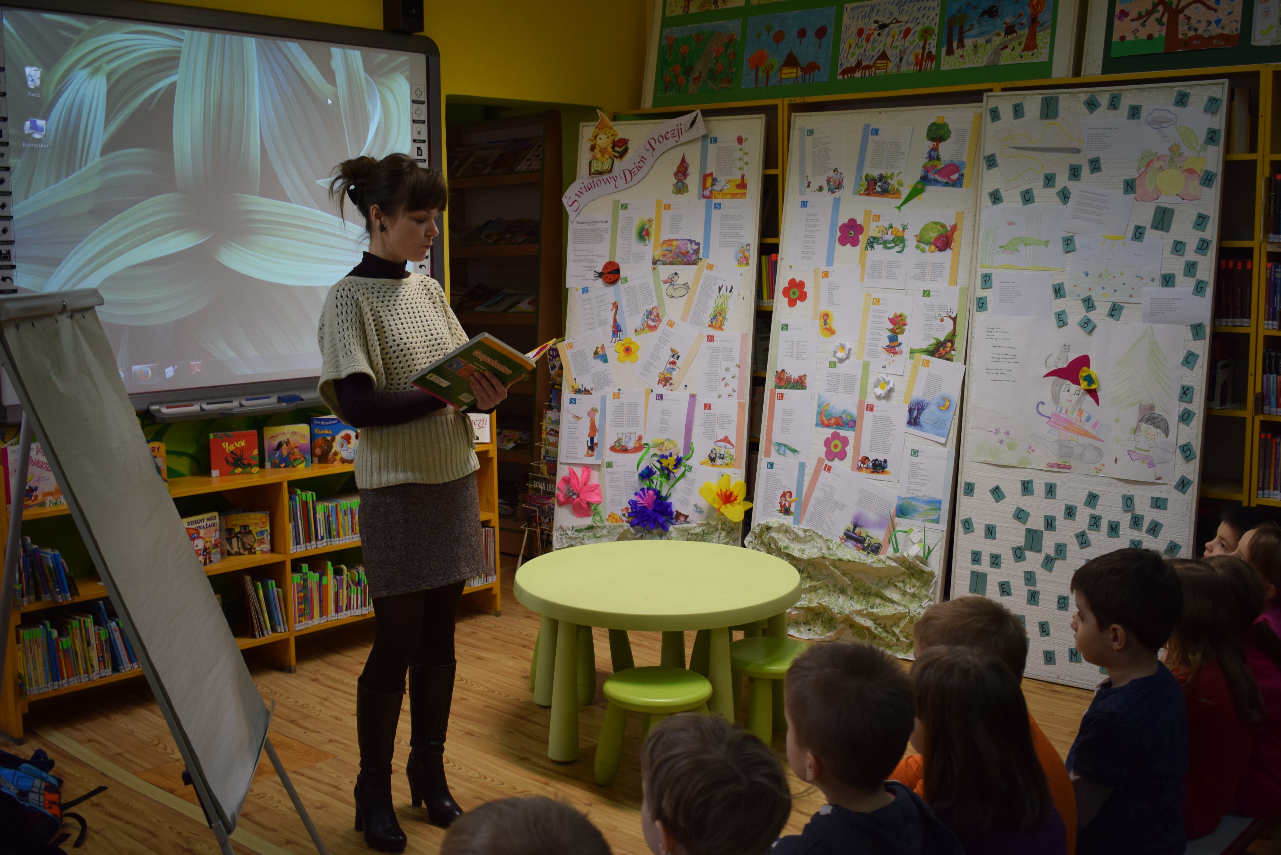 Dzisiaj (27 marca 2017 r.) odbyło się w Bibliotece Głównej kolejne spotkanie z cyklu "Poezja jest wśród nas". Uczniowie klasy II b ze Szkoły Podstawowej nr 2 przy tej okazji zaprezentowali wiersze, których wykonanie bardzo się wszystkim podobało. Posłuchaliśmy także poezji czytanej przez pana Piotra Fronczewskiego oraz panią Irenę Kwiatkowską.